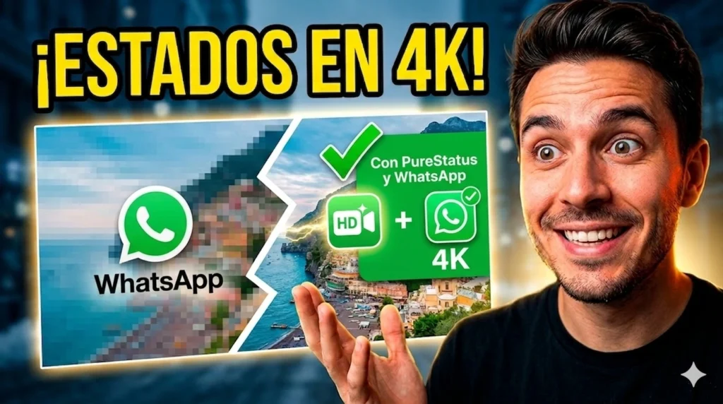Para subir estados de WhatsApp en HD sin perder calidad, la solución más efectiva es utilizar la aplicación PureStatus. Solo debes descargar la app, seleccionar tu video o foto, y elegir la opción de compresión sin pérdida. La herramienta optimizará el archivo manteniendo la nitidez original (HD o 4K) para que puedas compartirlo directamente en tus estados burlando el algoritmo de compresión nativo.